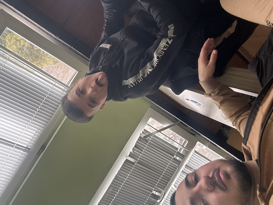 The scene is located in an indoor setting in Varna, Bulgaria. The image depicts two males captured in a close-up, upward-angled perspective, indicative of a selfie photograph. In the foreground, partially visible on the left, is the head and upper torso of a male. He has short, dark hair and a light beard or stubble. He is wearing a light brown or tan long-sleeved top with a dark vertical stripe or design visible on the chest. His expression is neutral, looking directly towards the camera. Positioned in the mid-ground, slightly to the right and above the first individual, is a younger male. He has short, dark hair with a fade or undercut style. He is wearing a black zippered hoodie, which features a white "EA7" logo on the right chest and "EMPORIO ARMANI" text horizontally along the left sleeve. He is looking towards the camera with his tongue extended. The background reveals a room with a light green wall in the upper left section. To the right, multiple windows are visible, equipped with white horizontal blinds that are partially open. Through the windowpanes, blurred outdoor foliage or trees, possibly bare-branched, are discernible, suggesting a view of an exterior environment. A dark, possibly wooden, surface is visible below the windows and to the right, along with a lighter wood-grain patterned surface closer to the bottom right of the frame. The overall lighting is bright, combining natural light from the windows with internal illumination.