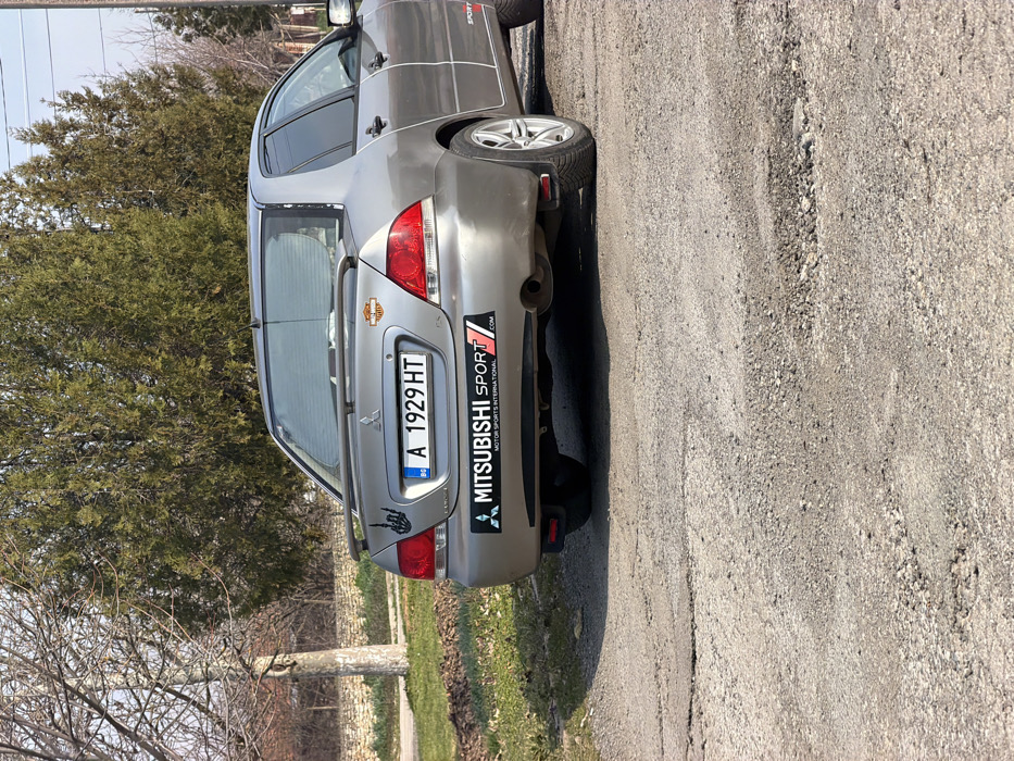 A silver four-door sedan, identified as a Mitsubishi by its rear emblem and "MITSUBISHI SPORT" decal on the bumper, is parked on an uneven, broken asphalt and gravel surface