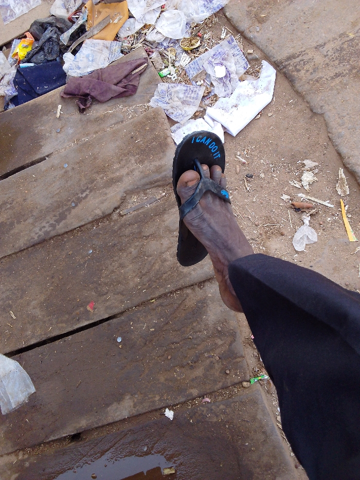 The image displays a downward-angled perspective of a dark-skinned human left foot, clad in a black flip-flop with the phrase "I CAN DO IT" printed in blue on its sole. The foot is partially covered by dark trousers. The scene depicts a mixed ground surface. To the left, a section of an aged, discolored wooden plank walkway is visible, featuring distinct parallel planks and a small puddle of liquid. To the right, the ground transitions to a lighter brown, dry dirt or earth patch, heavily strewn with various types of litter, including crumpled white plastic bags, dark fabric scraps, and miscellaneous small debris. A narrow concrete or paved edge separates the dirt area from an unseen surface on the far right. No visual information within the image definitively indicates its location within the city of Zaria, Nigeria.