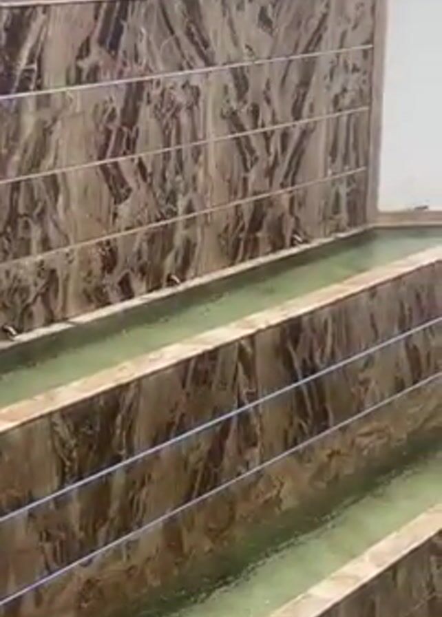 The video depicts a tiered indoor water feature. The water cascades down three levels, each a trough lined with brown-and-white patterned tiling. The backs of the troughs are also tiled, creating a continuous decorative wall. Thin metal wires run horizontally across the front of the troughs, seemingly for support or design. The water is slightly murky, with a greenish hue. The entire structure is placed against a white wall and under an open, shaded area with pillars and a roof. A group of people, dressed in a mix of formal and casual attire, are visible on the level above the water feature, engaged in conversation and standing around tables. The environment suggests a hotel or resort lobby.