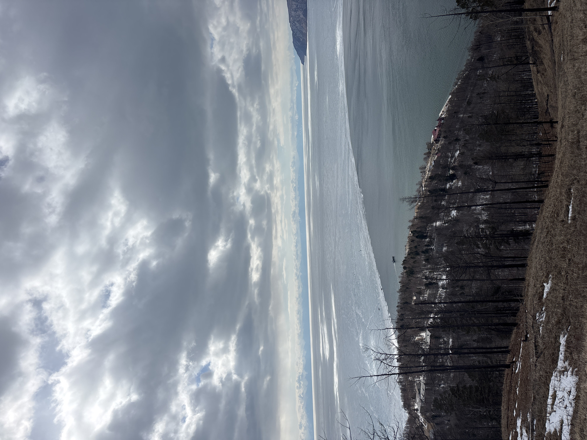 The image depicts a panoramic, elevated view of Lake Baikal in Nikola, Russia, under an overcast sky. The upper half of the frame is dominated by dense, grey cumulus clouds with intermittent brighter patches. The middle ground features Lake Baikal, distinctly bisected by a partial ice cover. The left side of the lake displays broken, partially frozen ice reflecting light, while the right side is open, dark grey-green water with visible ripples. A clear demarcation exists between the ice and open water. In the distance, a range of snow-capped mountains stretches along the horizon beyond the lake. Two dark-colored boats are present on the open water; one larger vessel moves towards the right, leaving a wake, and a smaller object rests near the ice edge. Several unidentifiable small, dark specks are visible on the ice surface. The foreground and mid-ground consist of a steep, undulating hillside descending to the lake. The immediate foreground is covered with sparse, dry brown grass and patches of melting snow. Numerous dark, bare trees, some appearing fire-damaged, rise from this terrain. Further down the hillside, the forest becomes denser, comprising primarily bare trees with some evergreen foliage. Along the lake's shoreline, at the base of the hill, a complex of light-colored buildings is visible on the left, and a cluster of buildings with distinct red roofs is situated on the right. A road or path parallels the water's edge. No individuals are discernible within the scene.