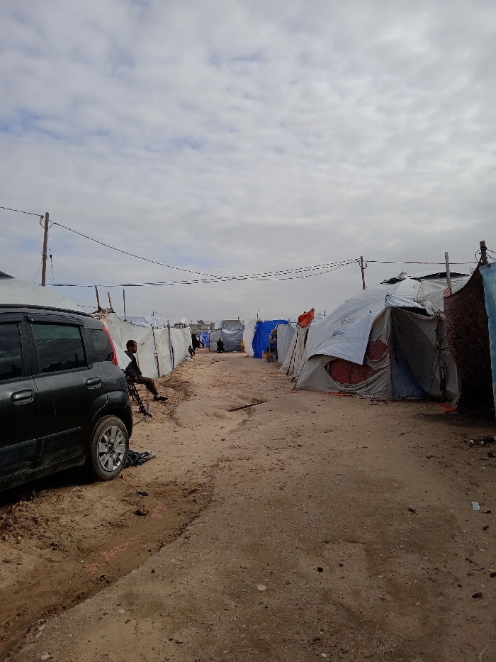 The image depicts a crowded, makeshift settlement in Khan Yunis, Palestinian Territory, under an overcast sky. A central, unpaved dirt path, showing tire tracks and depressions, extends from the foreground into the distance. On the left side, a dark grey compact SUV is parked with its passenger side facing the viewer, partially on the dirt path and partially on disturbed earth. A dark-skinned individual, possibly male, sits on a low object beside the car, holding a dark, long-barreled object consistent with a rifle across their lap. Behind the car, a continuous line of temporary shelters constructed primarily from white tarpaulin extends into the background. On the right side, a row of similar makeshift shelters, varying in construction, also lines the path. These shelters utilize white, blue, and reddish-brown tarpaulin materials, stretched over visible frames. One prominent tent on the right features a partially obscured, circular red object within its entrance. In the mid-ground and background along the path, several indistinct figures appear as dark silhouettes, suggesting people are present further within the camp. Overhead, multiple strands of dark utility wires are strung between two visible wooden poles, one on the left near the car and another further down the path on the right. The overall ground is uneven and unpaved, consistent with a temporary or undeveloped area.