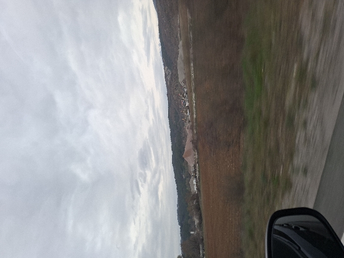 The image depicts an exterior scene likely captured from a moving vehicle in the vicinity of Cherniche, Bulgaria, under an overcast sky. In the immediate foreground, the black casing and reflective surface of a vehicle's side mirror are visible on the lower left, partially obscuring a blurred grey road and a strip of green and brown roadside vegetation. The midground features a large expanse of tilled, reddish-brown earth, characteristic of an agricultural field. Beyond this field, an industrial site or quarry is visible, characterized by multiple large, irregularly shaped piles of material, predominantly reddish-brown and light grey aggregates. Within this site, several structures, possibly buildings or machinery, are discernible. The background consists of a tree-covered hillside, rising towards a larger, distant hill or mountain range under the grey, cloudy sky. No identifiable individuals are present.