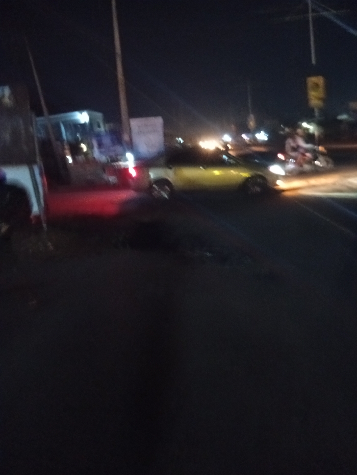 At night, a blurry image reveals a yellow convertible car on the road with lights illuminated. A motorcycle with a rider is beside the car. The scene appears to be a street with faint buildings and streetlights visible in the background. The foreground shows dark road surface, suggesting a low vantage point.