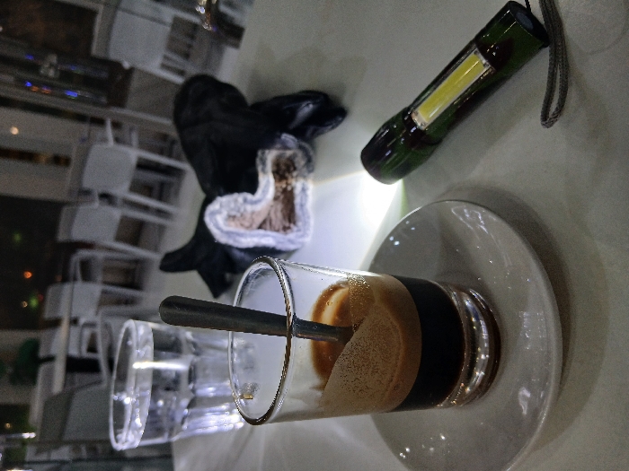 A tilted shot showcases a glass of espresso on a white saucer. A dark spoon rests within the coffee. To the left is a partially visible empty glass. Above the coffee, a black hat and scarf are visible, along with a small green flashlight with a lanyard. The background features out-of-focus chairs and tables, indicating an indoor or cafe-like setting.