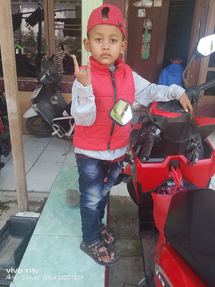 This full-body image, captured in Jagapura Kidul, Indonesia, on October 12, 2025, at 12:59 from a Vivo Y19s device, features a young boy posing outdoors