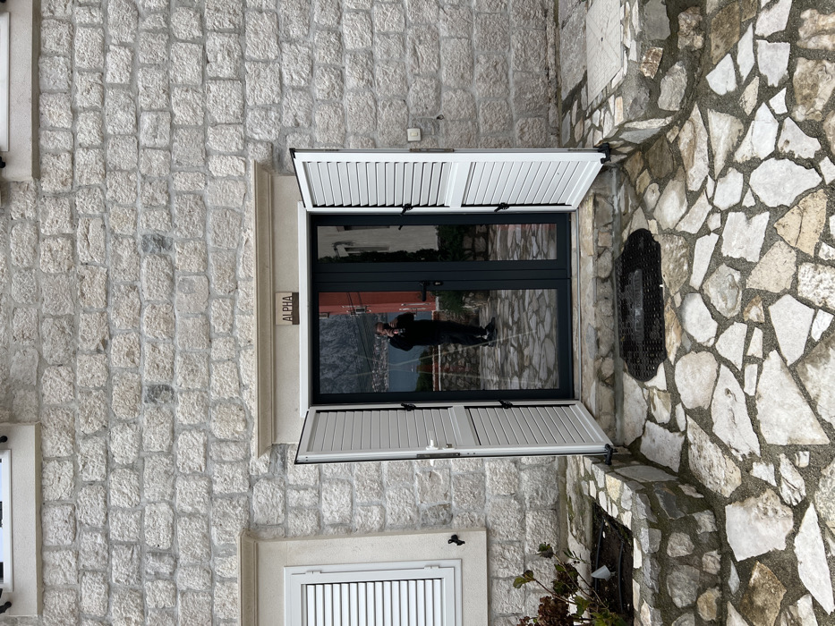 The image depicts the exterior of a building located in Bogdašići, Montenegro. The façade is constructed of light-colored, irregularly shaped rough-hewn stone blocks. A central entrance features a dark-framed double glass door, flanked by two open white louvered shutters with black hinges. Above the door, a small rectangular sign reads "ALPHA." To the left of the entrance, a closed white louvered window is visible, with a small stone planter box containing sparse vegetation below it. The ground immediately in front of the entrance is paved with irregular, light-colored flagstones, and a dark, textured doormat is positioned at the threshold. A reflection in the glass doors shows a person, presumably the photographer, standing directly in front of the door, holding a device (likely a camera or phone) to take the photograph. The individual is dressed in dark clothing, including a dark long-sleeved top and pants. The reflection also reveals a scenic background beyond the photographer, featuring a body of water (likely a bay), distant mountains, and structures along the shore, including a reddish building and utility lines.