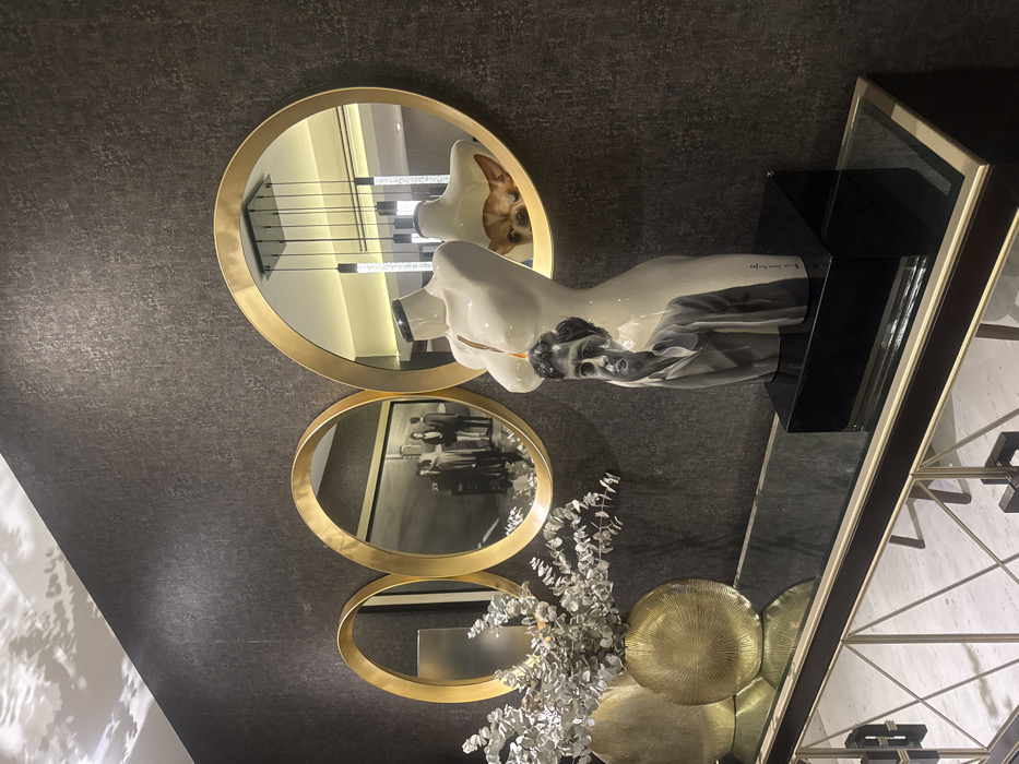 The image captures a detailed view of an interior space, likely a hallway or entryway, located within a building in Monterrey, Mexico. A dark, textured wall serves as the backdrop for three circular mirrors with thick, gilded gold frames, arranged horizontally above a console table. The console table features a dark body with intricate gold-toned metal crosshatch patterns on its front panels and a reflective glass top. On the left side of the table, two gold-toned, fluted vases hold sprays of light-colored, possibly silver-grey, artificial foliage. On the right side, a white ceramic or porcelain statue, depicting a female torso, stands atop a black rectangular plinth. A monochrome image of a man's head and upper torso is printed or painted directly onto the front of this statue. The mirrors reflect adjacent areas of the interior. The largest mirror, positioned on the right, reflects a section of a room with a light-colored ceiling (appearing yellow-toned due to lighting) and a modern black light fixture featuring multiple hanging pendant lights, some with clear, textured elements. Significantly, the head of a small, light-brown dog, with upright ears, is visible peeking from behind the white torso statue within this reflection. The middle mirror reflects a group of approximately five to seven individuals dressed in business-casual attire, standing and conversing in what appears to be another room or hallway, rendered in a monochrome tone. The leftmost mirror reflects a less distinct segment of the interior. The overall environment suggests a sophisticated and modern design aesthetic.