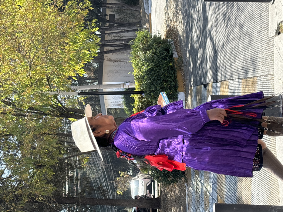 An elderly woman is seen outdoors, wearing traditional clothing. She has on a wide-brimmed white hat and a vivid purple dress with pleated details and a red sash. She is holding what appears to be a bundle of small whips or cords. The background includes trees, a sidewalk, and a street with vehicles. The scene is well-lit, suggesting it is daytime.