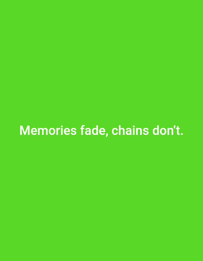 - "The image is a solid green background with the white text "Memories fade, chains don't" by FM-D0Nf62, licensed under CC BY 4.0
