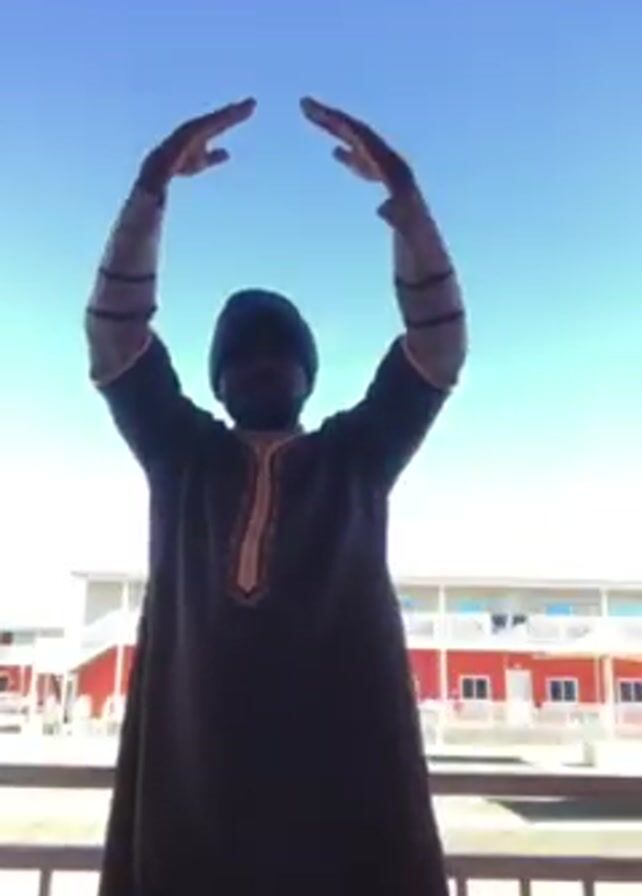 A man wearing a long dark brown robe with cream-colored embroidered trim and a dark knit cap is facing the camera. He is standing outdoors, with a building visible behind him and a blue sky above. He raises his arms above his head, touching his fingertips together to form a point. The camera angle is from a slightly low perspective, looking up at the man. The scene is well-lit and appears to be shot during daylight hours.