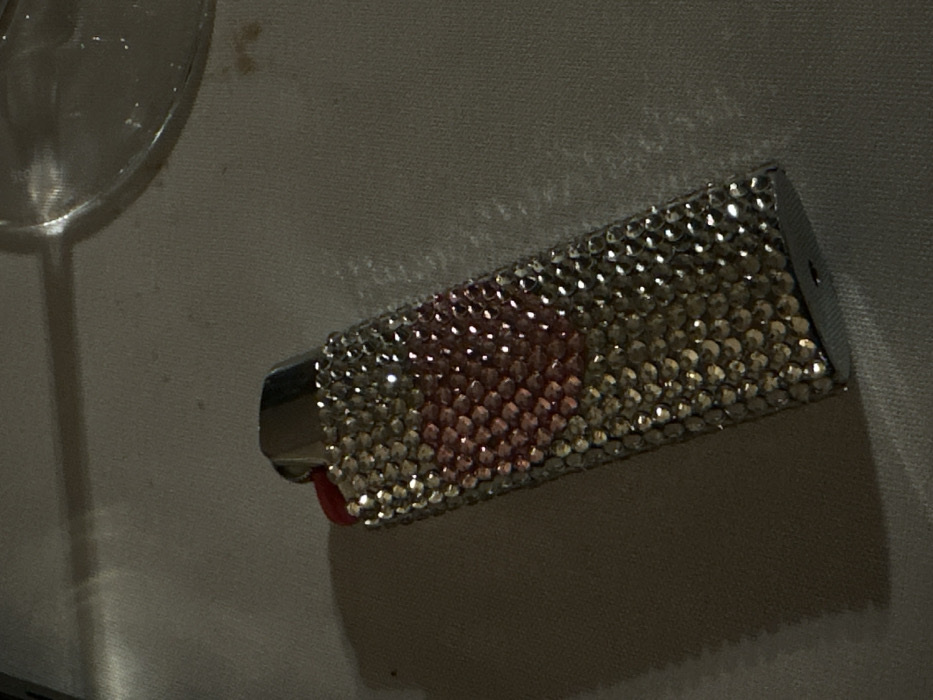- "A lighter, completely covered in rhinestones with a hint of pink, sits on a light grey textured surface, possibly a table cloth, with a shadow of a wine glass extending from the top left corner of the image to the bottom right corner" by FM-PbuA52, licensed under CC BY 4.0