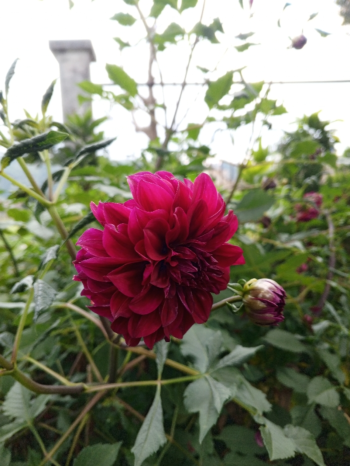 The image displays a close-up of a fully bloomed dark fuchsia dahlia flower, positioned slightly left of the frame's center. Adjacent to it on the lower right is an unopened dahlia bud, showing purple and green coloration. Both are attached to green stems with numerous green leaves, which fill the foreground and midground. In the blurred background, a tall, slender, grey concrete structure, resembling a chimney or pillar, is visible to the upper left. Additional out-of-focus green foliage and indistinct dark floral forms are present in the upper right background. The scene is outdoors under natural light, with a bright, largely white sky dominating the upper portion of the image. The location is in the city of Weintiapa, Liberia.