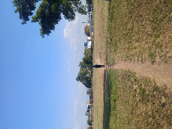 An open field under a blue sky edged by trees. A faint dirt path bisects the field, leading toward a distant figure. Buildings are partially visible in the background behind the line of trees. The grassy field is brown with hints of green.