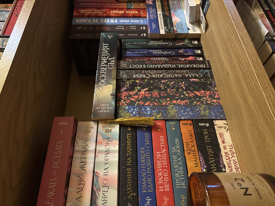 The image displays a close-up, static, eye-level view of a segment of a wooden bookshelf, presenting an organized collection of books in an indoor setting. This scene is situated in Veliko Tarnovo, Bulgaria, as indicated by the predominant use of the Bulgarian language on the book titles and local publishers. The primary subjects are numerous books, stacked and arranged on two visible light-colored wooden shelves. On the upper shelf, a horizontal stack of books on the left includes titles such as "ДЕЛКАТА НА РОЗАТА" (The Thorn of the Rose), "АЛЕНИ ЖЕРАВА" (Scarlet Cranes), and "ДАНИЕТО НА ДРАКОНА" (The Gift of the Dragon). To their right, a horizontally placed book titled "ОСКВЕРНЕНИЯТ СЪД" (The Defiled Court) by Робърт Джаксън Бенет (Robert Jackson Bennett) is visible, still enclosed in clear protective plastic. A golden, tasseled bookmark hangs from this book. Below it, a vertical row of books features dark, ornate covers, including "СЪДБА, НАПИСАНА С КРЪВ" (A Fate Written in Blood) by Даниела Дженсън (Daniella Jensen), "ПРОКЛЯТИЕ, ИЗДЪЛБАНО В КОСТ" (A Curse Carved in Bone) by Даниела Дженсън (Daniella Jensen), "САНДФИРЕНО-СИНЬО" (Sandfire-Blue) by Керстин Гир (Kerstin Gier), and "СМОРАГДОВО ЗЕЛЕНО" (Emerald Green) by Керстин Гир (Kerstin Gier). Further to the right on this shelf, additional books are visible, including "КНИГА ЗА ПЛАЖА" (Book for the Beach) by Емили Хенри (Emily Henry). On the lower visible shelf, a stack of vertically aligned books continues, featuring titles such as "ИМАЛО НЯКОГА ЕДНО РАЗБИТО СЪРЦЕ" (Once Upon a Broken Heart), "И ЗАЖИВЕЛИ ВЕЧНО НЕЩАСТНИ" (And They Lived Unhappily Ever After), "ПРОКЛЯТИЕ ЗА ИСТИНСКА ЛЮБОВ" (A Curse for True Love), a book by КЕРИ МАНИСКАЛКО (Kerri Maniscalco), and "ЕНЦИКЛОПЕДИЯ НА ФЕИТЕ" (Encyclopedia of Fairies) by ЕМИЛИ УАЙЛД (Emily Wilde). In the bottom left foreground, a portion of an amber-colored glass jar candle is visible, bearing a white label with text that includes "LAB. N°2" and "SUNSET IN CAPE". The wooden shelves exhibit a consistent grain and light-brown hue. No individuals are present, and no actions or interactions are depicted. The scene is illuminated by warm, ambient interior lighting.