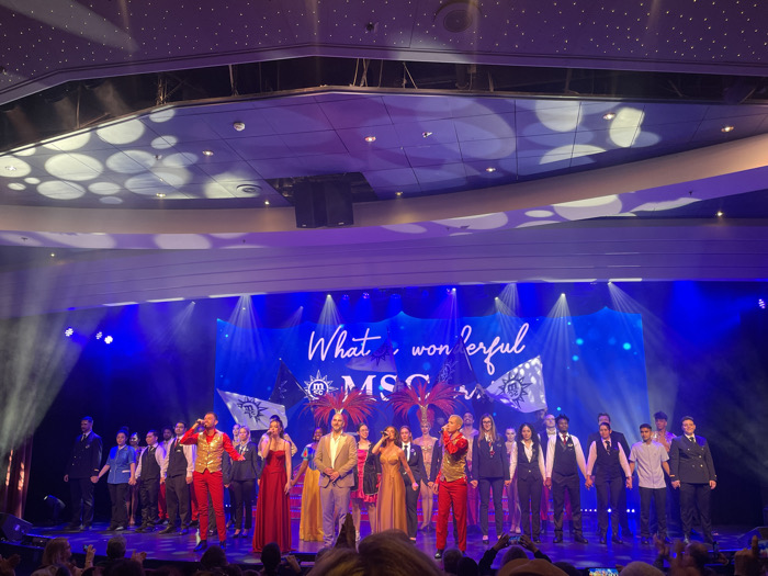 A stage with performers illuminated by blue spotlights. "What a wonderful MSC year" is displayed on a screen backdrop. The group includes men and women in diverse formal attire, including red and gold suits, a red gown, and naval uniforms. Some hold hands, while others stand at attention. The audience is visible in the foreground, with hands raised in applause. The room features a ceiling with patterned lighting and visible support structures.