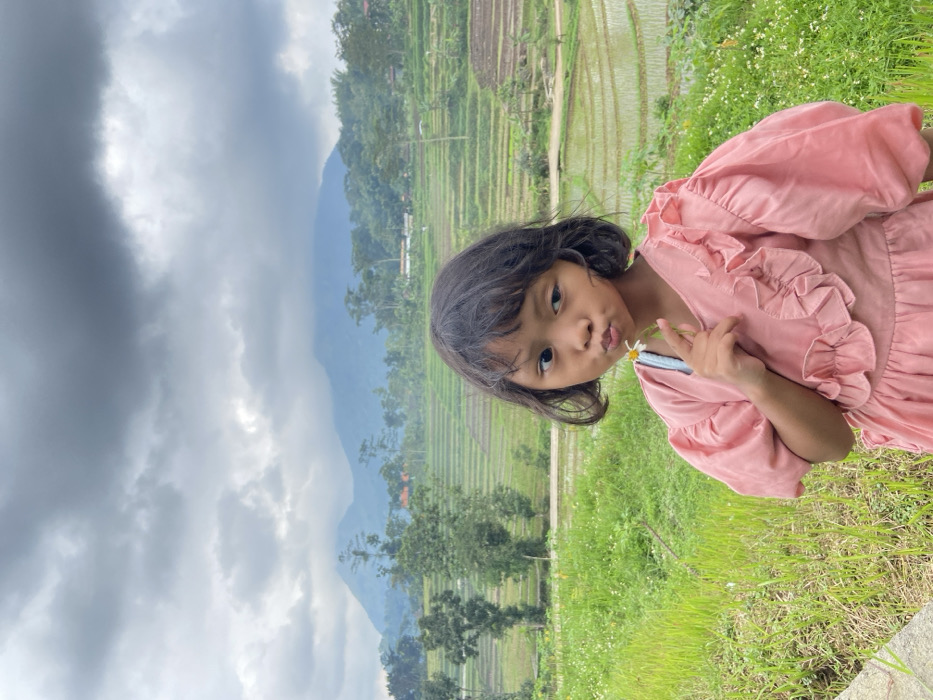A young girl in a pink dress stands outdoors, holding a daisy near her mouth and giving a peace sign. She is angled slightly to the right, with her dark hair visible. Behind her, a picturesque scene unfolds with rice paddies, green grass, and trees. A mountain rises in the background, partially obscured by a cloudy sky. The overall lighting suggests an overcast day.