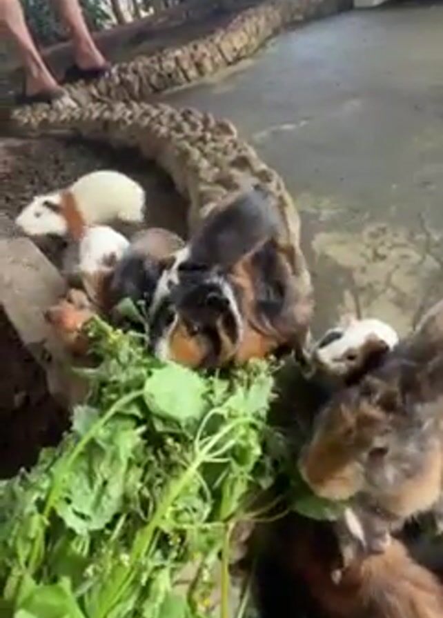 group of guinea pigs of various colors (white, brown, black, and mixtures) eating a large bunch of green leafy vegetables. They are gathered around a stone-edged area, with more guinea pigs visible in the background. A person's legs are visible in the upper left corner, indicating someone is nearby, possibly the one holding the vegetables. The area appears to be part of an outdoor enclosure with plants and stone features.