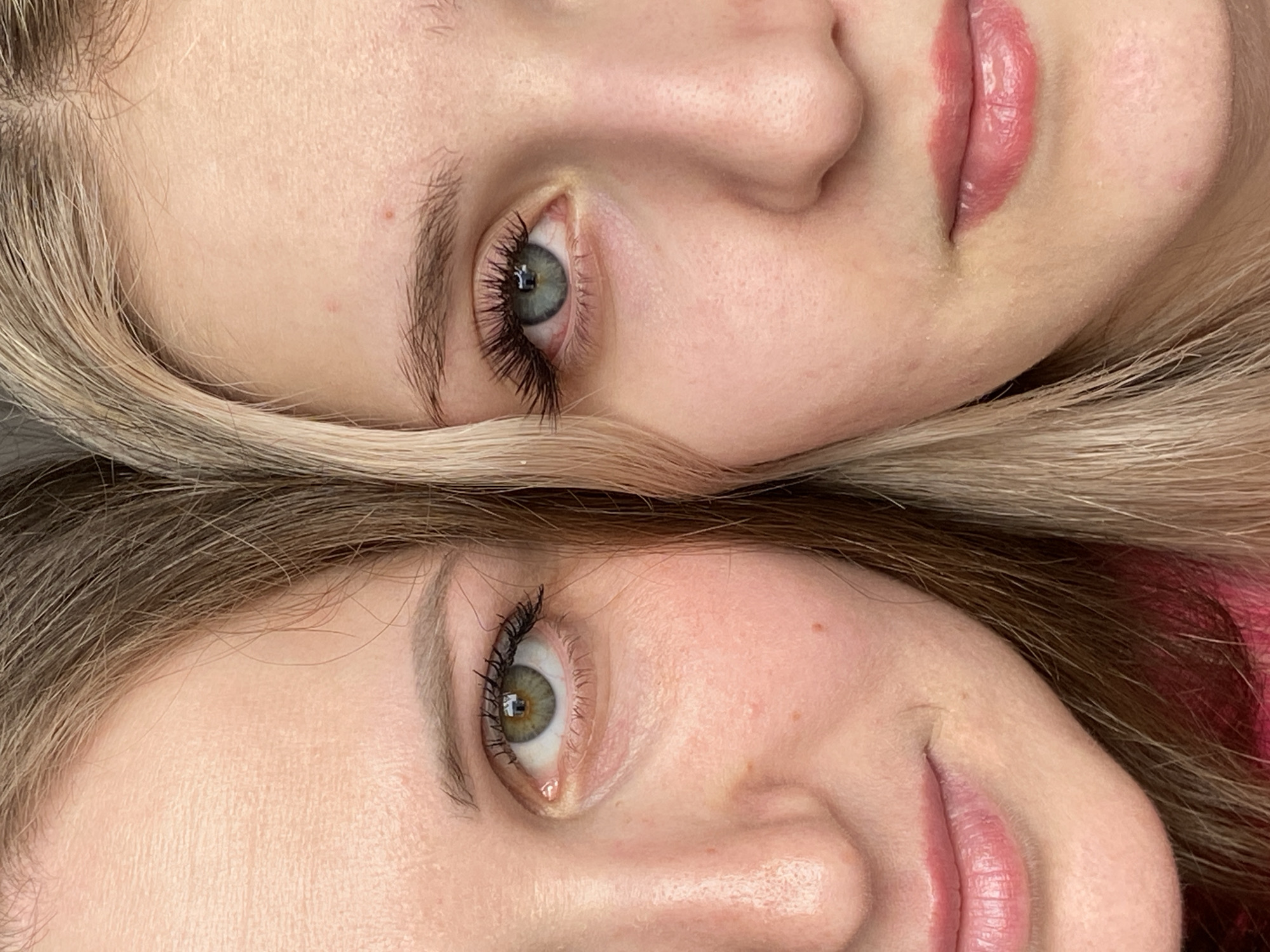 faces of two women lying side-by-side, oriented upside down relative to each other. The woman on top has blonde hair and blue eyes, while the woman below has light brown hair and hazel eyes. Both women have fair skin, full lips with lip gloss, and visible eyelashes. The background is blurred. There is no discernible evidence indicating the location is Markovskii, Russia.