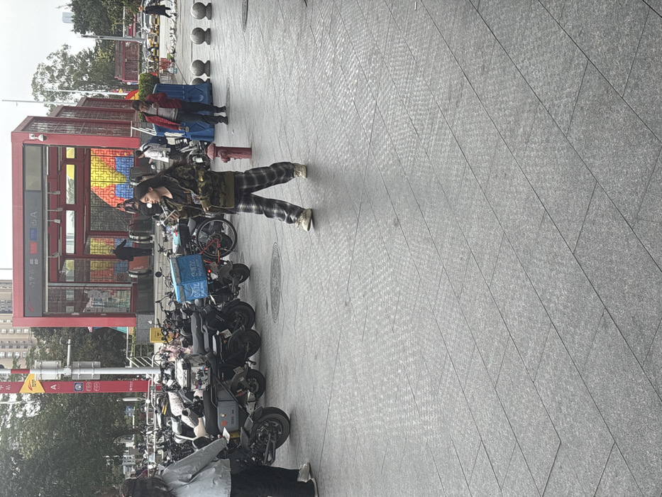 A street scene shows a woman in plaid pants standing beside parked scooters and a red fire hydrant. A red structure with colorful panels is behind her. More parked scooters line the street. Other people are visible in the background. The ground is tiled with gray paving stones.