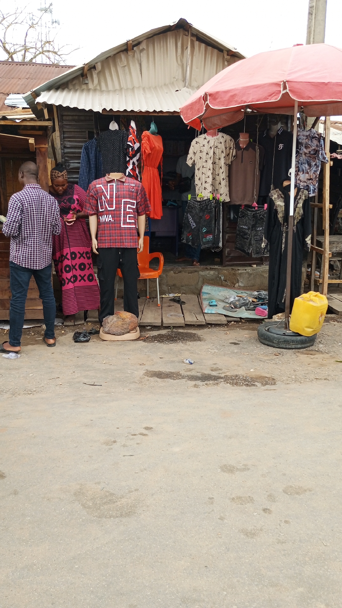 The image depicts a street-level scene in Zango-ndaji, Nigeria. A small, open-front shop displays clothing for sale, with garments hanging from the shop's structure and on a headless mannequin. Two customers, a man in a plaid shirt and jeans and a woman in a patterned pink and maroon dress, are looking at the merchandise. An orange plastic chair is partially visible near the mannequin. The shop has a corrugated metal roof and a makeshift wooden platform in front. An umbrella is positioned to the right of the shop. A yellow container sits on a tire, possibly for water storage. The street surface is asphalt and shows signs of wear.