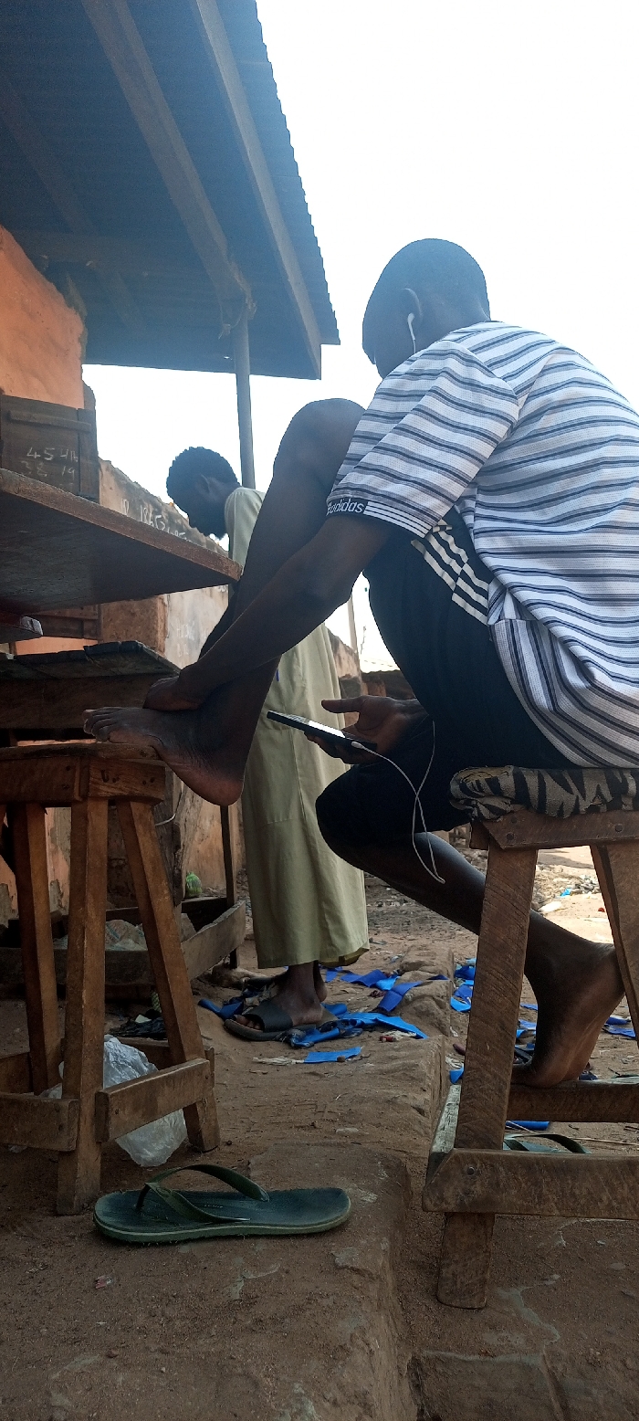 This image, captured in Doma, Nigeria, depicts an outdoor scene featuring two adult males and various objects within what appears to be a market stall or roadside shop. In the foreground, an adult male with dark skin and short hair is seated on a wooden stool, facing away from the viewer but with his right side visible. He wears a white and dark blue horizontally striped short-sleeved shirt with an "adidas" logo on the right sleeve and dark shorts. He is barefoot; his right foot is propped on a crossbar of the wooden stool, while his left foot rests on the dirt ground. He holds a dark smartphone horizontally with both hands, appearing to look at the screen, and has white wired earphones with one earbud visible in his right ear. The stool he sits on is covered with a striped fabric cushion. To the left, an adult male with dark skin and a beard is partially visible, standing behind a wooden counter or shelf. He wears a light-colored, long garment, possibly a traditional robe, and is also barefoot. He appears to be bending over something on or under the counter; his actions are obscured. Numerical markings "4541k" and "4. 19" are visible on a wooden surface behind him. The environment consists of reddish-brown dirt ground. Overhead, a corrugated metal roof supported by wooden beams provides shade. An orange-brown building wall is visible on the far left. On the ground, between and around the individuals, are scattered pieces of blue material (possibly fabric scraps), a crumpled white plastic bag, and two pairs of dark flip-flops (one green, one dark). The scene is illuminated by bright, diffused daylight.