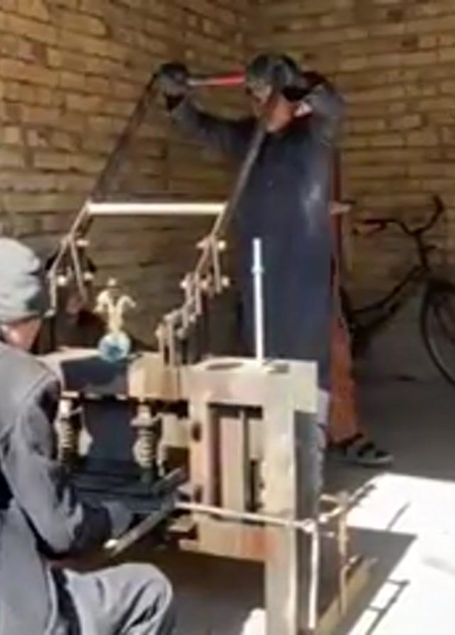 In a well-lit workshop with exposed brick walls, a group of four individuals are engaged in some type of metalworking activity. On the left, an adult wearing a black jacket and a grey beanie is seated, operating a machine consisting of a large metal press. The machine is being manually operated by a second person standing next to the press, raising a lever, apparently providing the necessary force. A third adult stands to the right, observing, clad in a brown robe. Beside him, a boy also dressed in a brown robe watches the process. Behind the operators is a bicycle leaning against the wall. To the right side of the frame, several cylindrical, metal objects appear to be stacked. The video is shot from a static camera position, offering a clear view of the workshop and the people within it.