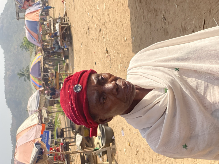 The image depicts an outdoor market in Nagazi, Nigeria, under bright daylight. In the foreground, an older dark-skinned woman is positioned slightly off-center to the right, observed from the chest up. She wears a dark red velvet headwrap, secured with a circular brooch featuring a dark center and a silver-colored rim. A white, textured shawl with small green embroidered star patterns is draped over her shoulders. Her face is turned slightly to her left, with a neutral expression. The background reveals a dry, light brown ground market populated with numerous makeshift stalls. These stalls are constructed from wooden frames and covered by various colorful umbrellas providing shade, including orange, blue, and multi-striped designs. Visible objects at the stalls include dark basins, cooking pots, and assorted market goods displayed on tables. Indistinct human figures are present among the stalls, engaged in various activities. A partially legible sign at one stall reads "CASH AVAILABLE HERE". In the far background, a range of green hills is visible beneath a clear sky, with a single palm tree situated amidst the market structures.