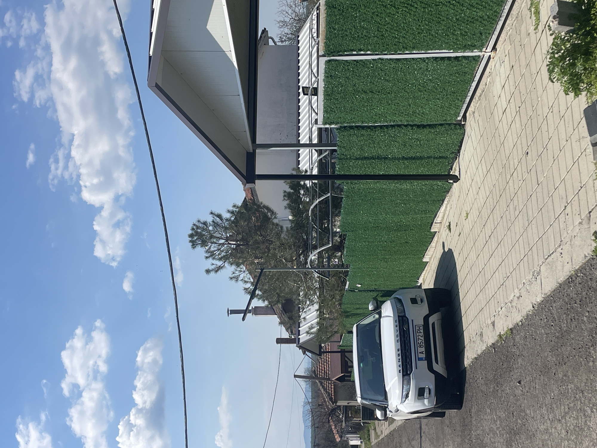 white Range Rover car parked on a paved driveway in front of a building in Kamenar, Bulgaria. Above the car is a green fence. The sky is blue with scattered clouds. A utility pole is visible with wires running across the sky.