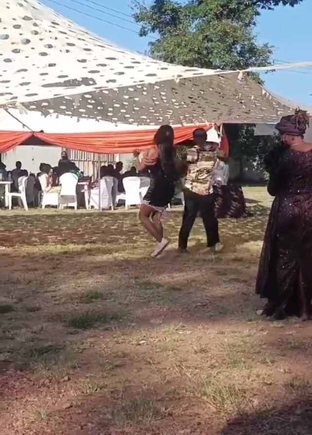 daytime outdoor event with a large white tent decorated with orange fabric. People are seated at tables under the tent. In the foreground, a woman in a long brown sequined dress stands while a man and a woman dance in front of her. The man wears a patterned shirt and dark pants, and the woman wears a short black dress and white shoes. They are holding hands and spinning around. A few other people are visible in the background. The ground is covered with dry grass and leaves. There is a large tree to the right of the tent. The sky is blue and clear.