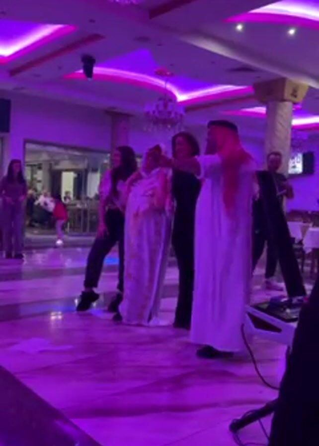 group of people in what appears to be a party or celebration setting. There are four people in the foreground: a woman wearing a patterned white robe-like dress, flanked by two other women wearing casual outfits (one in black pants and a white top, the other in a black dress), and a man in a traditional white Arabian robe with a red and white headdress. They are posing for a photo, with the man pointing towards something out of frame. The room is lit with purple lights, and there are chandeliers hanging from the ceiling. Tables are set up in the background, and other people are visible in the background, including some who are seated. The floor appears to be tiled.
