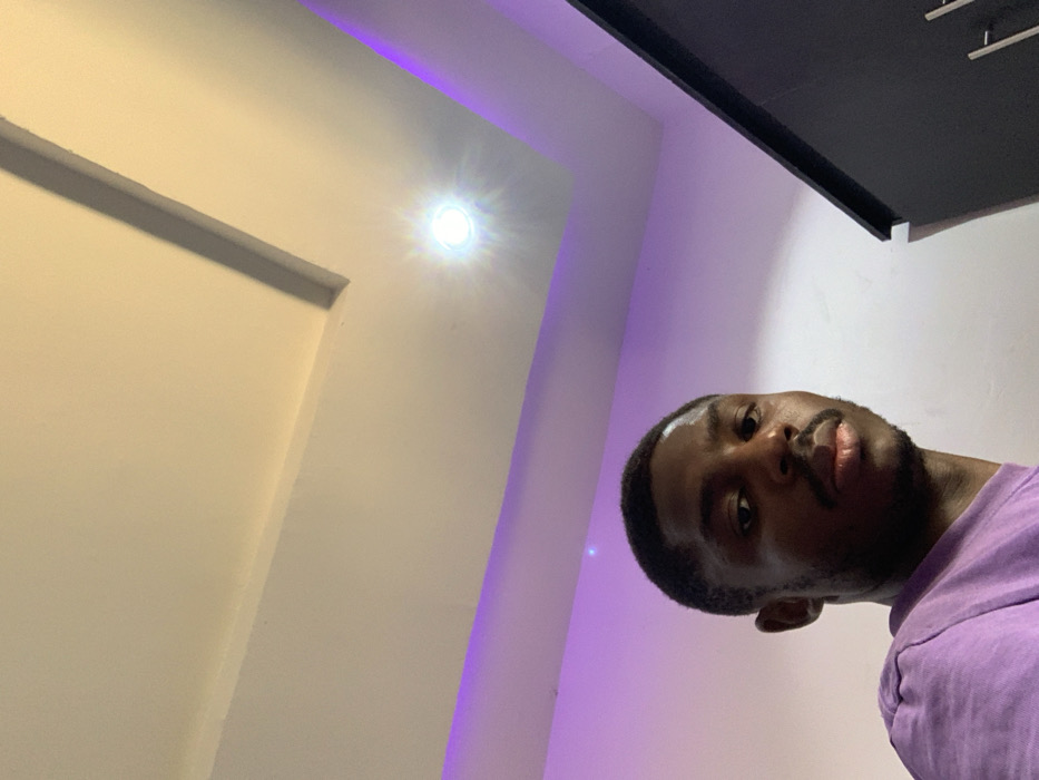 The image depicts an indoor setting in Jos, Nigeria. A male subject, visible from the chest up, occupies the lower-left portion of the frame, looking directly towards the camera. He has dark skin, short dark hair, a mustache, and a short beard. He is wearing a light purple short-sleeved shirt. His forehead and upper lip exhibit a slight sheen. The background features a white, multi-tiered ceiling with a bright, circular recessed light fixture emitting a starburst effect in the upper-right quadrant. Below the ceiling, a strip of purple accent lighting illuminates the upper portion of the white wall. To the right of the subject, a section of a dark-colored cabinet or wardrobe with metallic handles is partially visible. The overall perspective is from a low angle, looking upwards.