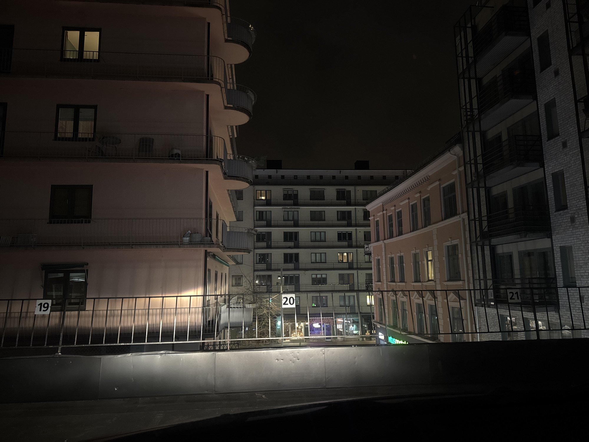 The image depicts a nighttime street view in Oslo, Norway. In the foreground is a dark barrier or wall, likely a bridge or elevated walkway. Behind this barrier, three buildings are visible. To the left is a light-colored building with multiple floors and rounded balconies. In the center is a taller, more rectangular building with numerous windows. To the right is another building, with an architectural design that appears to be a mix of brick and light-colored stucco, with visible balconies. The building on the right has an external fire escape. Attached to the barrier are signs with numbers "19," "20," and "21". The overall lighting is dim, but some windows are illuminated. Streetlights and store signs are visible in the background. No people are clearly visible in the image. The weather appears clear.