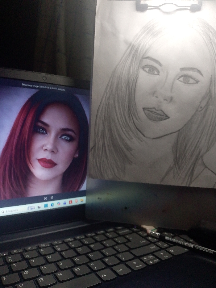 The image showcases a laptop screen displaying a vibrant portrait of a woman with deep red hair and striking blue eyes, contrasted against her red lipstick. Positioned next to the laptop is a hand-drawn sketch of a similar woman, though rendered in pencil and lacking color. The drawing is secured with a clipboard. The image foreground includes the laptop keyboard and a pencil, suggesting the artistic process involved in creating the sketch.