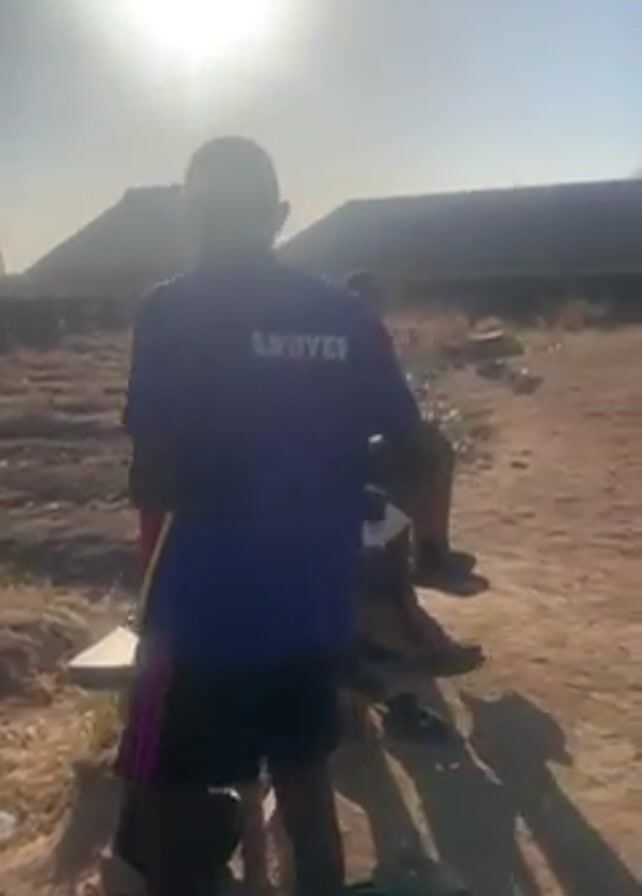 man standing facing a group of five children sitting on a bench in an outdoor setting. The man is wearing a blue shirt with "SNYEP" printed on the back and dark shorts. The children are all seated on a wooden bench, facing away from the camera. The setting appears to be a dusty, undeveloped area with some low-rise buildings visible in the background. The sun is bright, creating a strong backlight. The man seems to be addressing the children.
