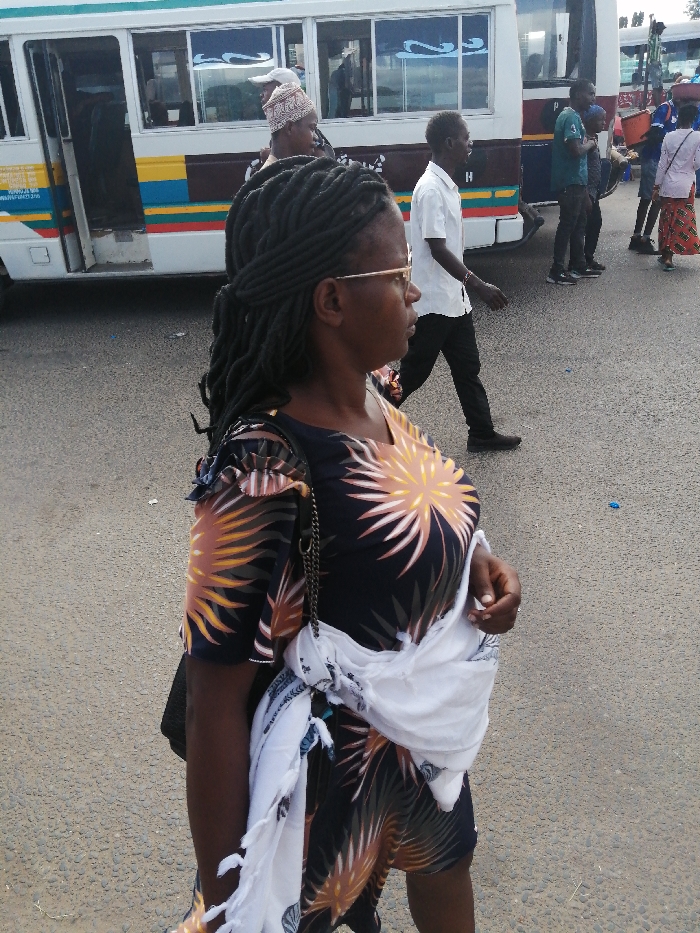 A woman with braided hair and glasses stands in the foreground. She wears a patterned dress and has a white scarf draped over her shoulder. Behind her, a bus with people boarding is visible, along with other pedestrians. The scene appears to be a street or transportation hub. The road is made up of pavement.