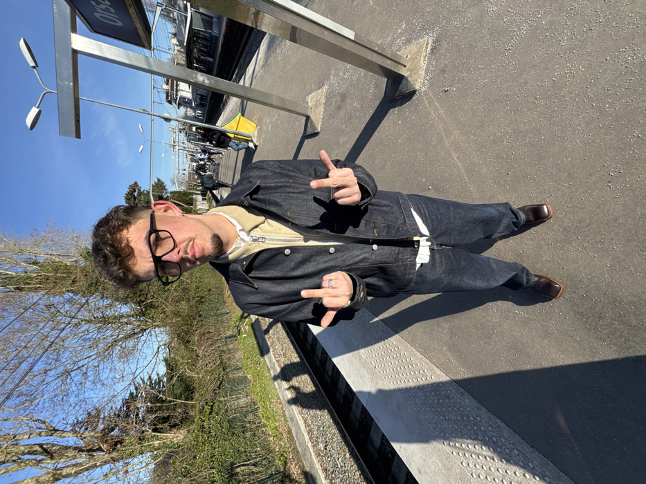 A male individual stands centrally on a concrete train station platform in Orsay, France, under a clear blue sky. He wears black-framed glasses, a beige zipped jacket under a dark blue denim jacket, dark blue denim jeans, and dark brown square-toed shoes. Both hands are raised, with the middle fingers extended forward. A silver ring is visible on the ring finger of his left hand. To the left, train tracks with gravel are visible, bordered by a vegetated embankment with bare trees and a fence. To the right, a metallic structure supports overhead lighting and a sign with "Orsay" visible. Several other individuals are present in the distant background on the platform. Strong sunlight casts prominent shadows, including the subject's shadow on the platform and tracks, mimicking his posture.