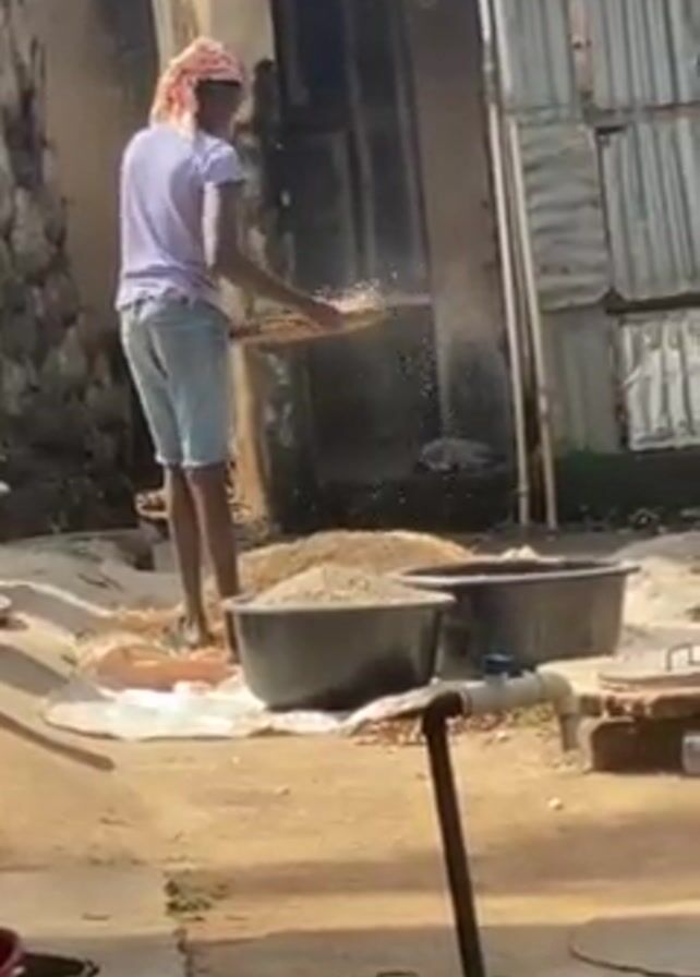 A young person wearing a light purple shirt, denim shorts, and a headscarf is sifting grains or seeds outdoors. They are standing on a light-colored surface near a pile of material and two large black tubs. The person is using a flat, sieve-like tool to sift the material, with particles falling from it. Behind the person is a building with a small window and a wall covered with corrugated metal. The area appears to be a courtyard or backyard setting. There are other objects scattered around, including buckets and a metal pole.