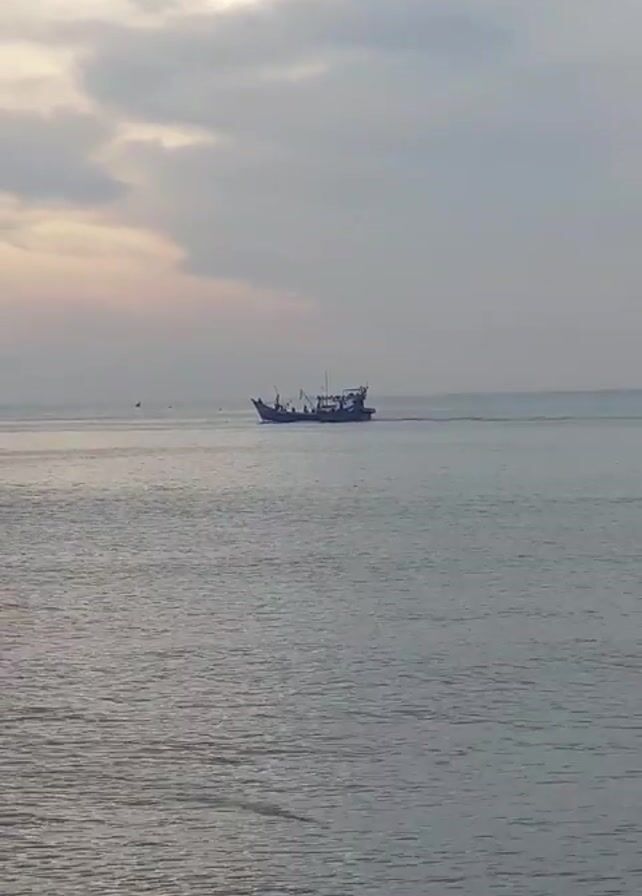 small, motorized boat moving on calm water under a sky with gray and light-colored clouds. The boat is in the center of the frame, moving from left to right. The water has a silvery sheen, reflecting the overcast sky. A hint of distant land is visible on the horizon.