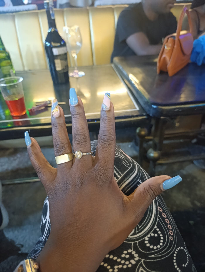 A dark-skinned hand is raised, displaying a set of manicured nails in a light blue hue with some accent nails. A gold band and an ornate ring adorn the ring finger. The hand is positioned in front of a dimly lit table setting that includes a wine bottle, wine glass, and a half-filled glass of red liquid. A person and a small brown purse are visible in the background, adding to the restaurant ambiance. The individual is wearing patterned pants.