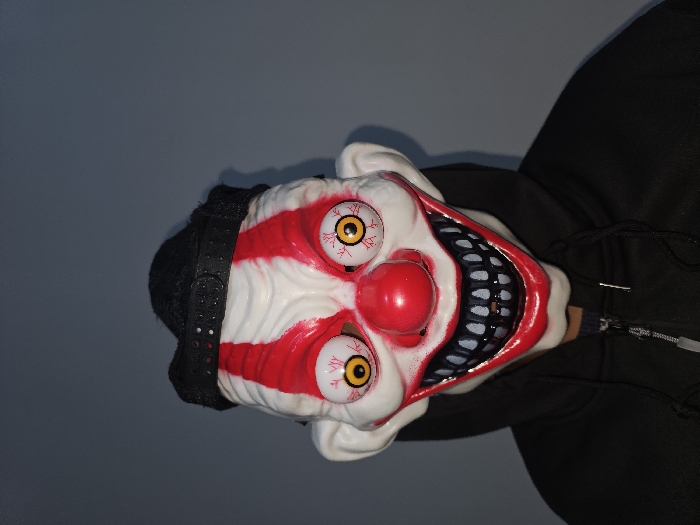 A person wears a sinister clown mask. The mask is white with red stripes, bulging eyes with yellow irises and red veins, and a large red nose. A wide, toothy grin with grey teeth adds to the terrifying effect. The person is also wearing a black hooded sweatshirt and a black hat, further concealing their identity. The background is a neutral grey, emphasizing the mask's disturbing details.