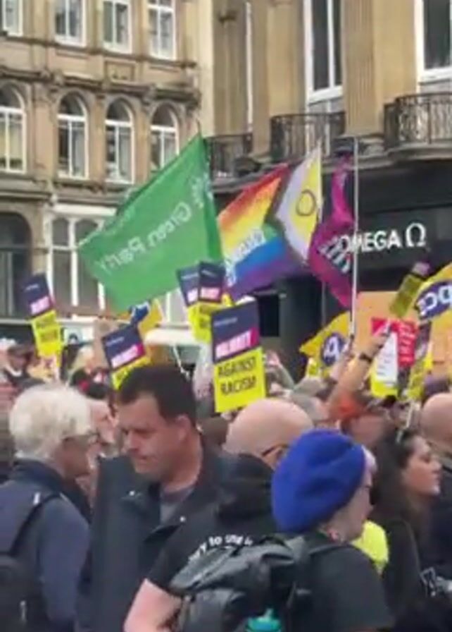 crowd of people holding signs and flags during a protest. Many signs read "Majority Against Racism". A green flag and a rainbow flag are visible. The protest is taking place in a city center, with buildings in the background. The protesters are moving forward slowly, carrying their signs and flags.