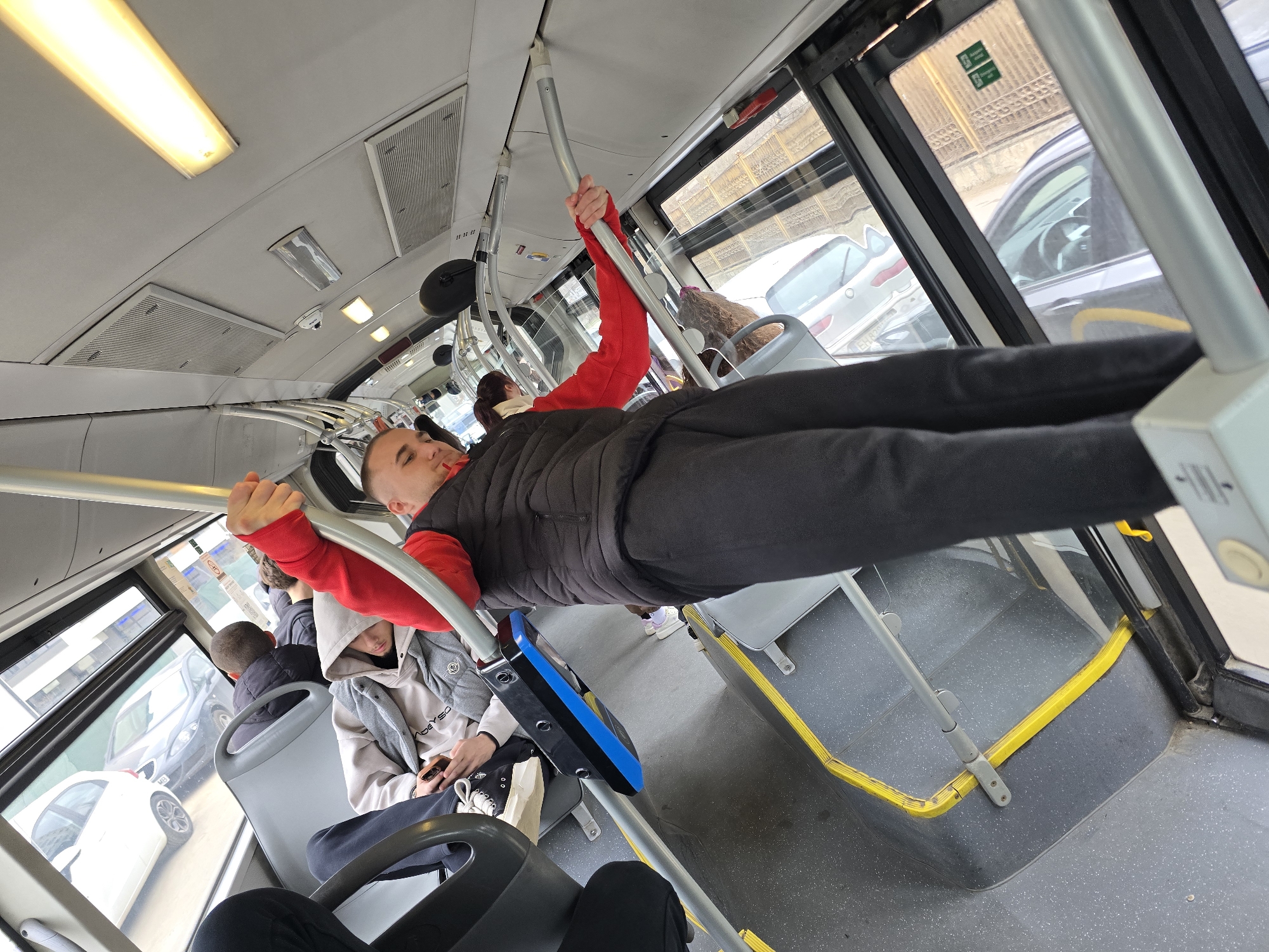 The image displays the interior of a public transport vehicle, likely a bus or trolleybus, in motion within the city of Sofia, Bulgaria. The perspective is tilted, looking towards the front-right from a low vantage point near the floor. A male individual, approximately 20-30 years old, with short dark hair, stands prominently in the center. He is wearing a red long-sleeved shirt under a black sleeveless puffer vest and black trousers. Both of his hands grip overhead silver horizontal grab rails, indicating he is standing for stability while the vehicle is in transit. His gaze is directed downwards and to the left of the frame. To the left, a younger male passenger is seated, wearing a light grey hooded sweatshirt and a grey vest, focused on a smartphone held in his hands. Black Converse-style sneakers are visible on his feet. A black and blue electronic ticket validator is mounted on a vertical pole adjacent to this passenger. Further into the vehicle, additional passengers are visible, primarily seated, including one male with the back of his head visible, wearing a black jacket. The vehicle's interior features a grey speckled floor with distinct yellow anti-slip strips, grey molded plastic seating, and a light grey ceiling equipped with rectangular air conditioning vents and elongated fluorescent light fixtures. Large windows on the vehicle's side reveal the exterior environment: a street with parked vehicles, including a white car and a dark grey sedan bearing a Bulgarian license plate (e.g., "EH 6231 AH" with a "BG" country code). Reflections of urban buildings are also visible through the windows. The scene depicts a typical daily commute in an urban setting.