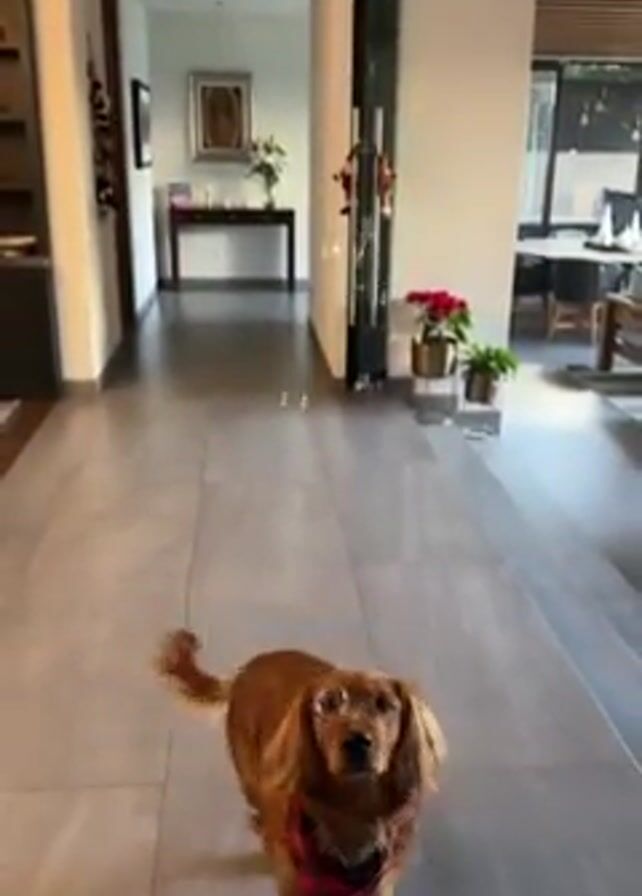 medium-sized golden-brown dog with long, wavy fur, standing on gray tiled flooring in a modern-style house. The dog is wearing a red and black plaid bandana around its neck. Bubbles float in the air near the dog. The dog jumps up and snaps at the bubbles, then turns to look at the camera. In the background, there's a hallway leading to another room, with a table decorated with a floral arrangement and a framed picture on the wall. To the right is a dining area visible through a partially open folding glass door. Indoor plants are placed in decorative pots near the doorway. On the left is a built-in cabinet with shelves. The lighting is bright, and the overall environment appears clean and well-maintained.
