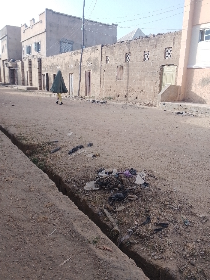 The scene depicts an unpaved dirt road in Panshekara, Nigeria, under a clear, light blue sky. In the foreground, a narrow, unlined drainage trench runs parallel to the road on the left, containing scattered refuse including plastic bags, fabric, and other debris. A significant pile of accumulated waste is visible adjacent to the trench on the right side of the image. In the mid-ground, a lone individual, seen from behind, walks away from the viewer on the dirt road. The person wears a long, dark olive-green garment that covers their entire body and head, with bright yellow trousers and black shoes visible beneath. A tall wooden utility pole with overhead wires stands on the right side of the road. The background features a row of buildings. On the left, several two-story structures with weathered facades, multiple windows (some with shutters), and doors are visible. On the right, a single-story wall constructed from light-colored concrete blocks features several small, decorative square ventilation blocks and at least two brown wooden doors. Adjacent to this wall, a light green door with a short concrete step leads into a building, which then transitions to a section of a multi-story building with lighter-colored walls and white-framed windows.
