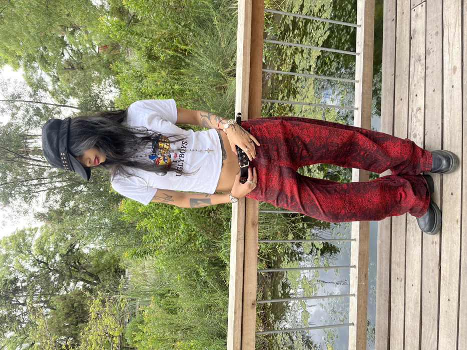 A person stands on a wooden walkway beside a body of water. They wear a white t-shirt with "UGLYBOYS" printed on the front, exposing their midriff. Red and black patterned pants, a black belt, and black boots complete the outfit. The person also wears a black hat. Green foliage is visible in the background.