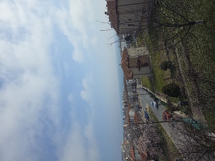 The image displays an elevated view of a residential area in Byala, Bulgaria, under a partly cloudy blue sky. The upper two-thirds of the frame consists of the sky with scattered white cumulus clouds, transitioning to a distant body of water (the Black Sea) on the horizon in the upper-midground. The midground and background show numerous two to three-story residential buildings with light-colored facades and orange terracotta tiled roofs, distributed across a gently sloping terrain. A paved road, likely asphalt, traverses the scene from the lower-left, curving towards the mid-right. A silver sedan is visible on the road, heading away from the viewer, with an older model orange van positioned behind it. The immediate foreground features a mix of green grass, bare deciduous trees with dark branches, and a tree exhibiting pink blossoms on the left side of the road. Maintained green lawns and small evergreen shrubs are present between the road and the buildings. Fences delineate property boundaries. No individuals are discernible within the frame. The scene is illuminated by natural daylight.