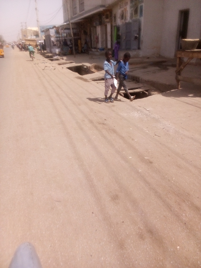 The scene captures an outdoor street in the city of Rangaza, Nigeria, under bright daylight. Two boys are prominently featured in the mid-ground, walking from the viewer's left to right. The boy on the left wears a light blue short-sleeved collared shirt, light-colored trousers, and sandals, holding a white object in his left hand. His right arm rests on the shoulder of the second boy. The second boy wears a darker blue long-sleeved shirt with rolled-up sleeves and dark trousers, and appears to be holding items in his left hand. Both are navigating a section of the street characterized by multiple open, rectangular concrete drainage structures or large potholes, situated between a dusty, light brown unpaved road with visible tire tracks and a paved sidewalk area. Along the right side of the street, a multi-story building with several storefronts, some secured with metal shutters and others open, is visible. A wooden stand with a dark-colored bowl rests on the far right. In the distant background, other pedestrians, a cyclist, and a partially visible yellow vehicle can be seen on the street, beneath overhead utility lines and poles.