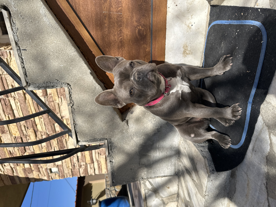 A blue French Bulldog, wearing a pink collar, sits upright on a black mat with blue trim, positioned on a concrete step