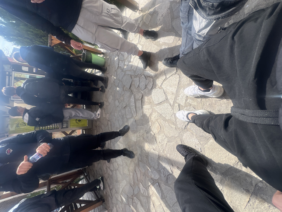 An outdoor scene captures at least eight individuals gathered on an irregularly paved grey stone surface under direct daylight. The view is from a low perspective, showing the lower extremities of three subjects in the immediate foreground: one wearing black pants and black athletic shoes, another in black pants with a visible drawstring and white athletic shoes, and a third in light blue jeans and black athletic shoes. In the mid-ground, a male subject, dressed in a black jacket and black pants, holds a clear plastic bottle with a blue label, appearing to manipulate its cap. To his right, two light green vending machines are visible, with several other male subjects standing near them. One individual wears grey sweatpants and white athletic shoes, another a black jacket and backpack, and a third light grey cargo pants featuring square utility pockets. A green cylindrical trash receptacle is partially visible to the right of the vending machines. Wooden structural elements, likely part of an outdoor canopy or railing, are present on both the left and right edges of the frame. Green foliage is visible in the upper right background. Strong shadows are cast on the paving, consistent with overhead sunlight. The precise location within the city of Kardzhali, Bulgaria, is not identifiable by specific landmarks in the image, but it depicts a common outdoor gathering area with vending facilities.